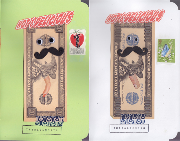 As usual, Installments can barely contain itself, overflowing chock-full of image and text, color and content. This issue is past and present, wrinkling “fish” fortune-tellers and excerpts from After Dark magazine, Paw Patrol stickers and Premier League football trading cards. Amongst and below, on top and beside lay rubber stamps, stickers, collaged bits and drawings, as well as text about today’s headlines and questions about what makes a book a book. Each edition is handmade and unique, variations in specific content and composition will vary. Also inside: Shunga clips, Sno-cone cups, Covid-19 vaccination stickers, Polaroids, and artist postcards stamped and ready-to-mail.
