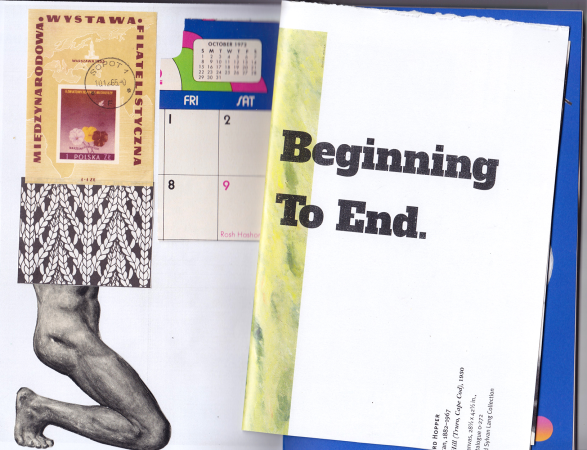 “Includes (probably): Wooden matches, a tea bag, artist stamps, cut-outs from “Flipper” coloring book, foam adhesive letters, paint, rubber stamps, baseball card, silver leaf, various tapes, a playing card from Germany, a mini-book about time, silver foil, the world’s shortest poem, Physique Pictorial pages mixed with pages from a book about Bernini’s sculptures, unique postcard, Playgirl magazine subscription card, a finger (from a glove) and a doily.”